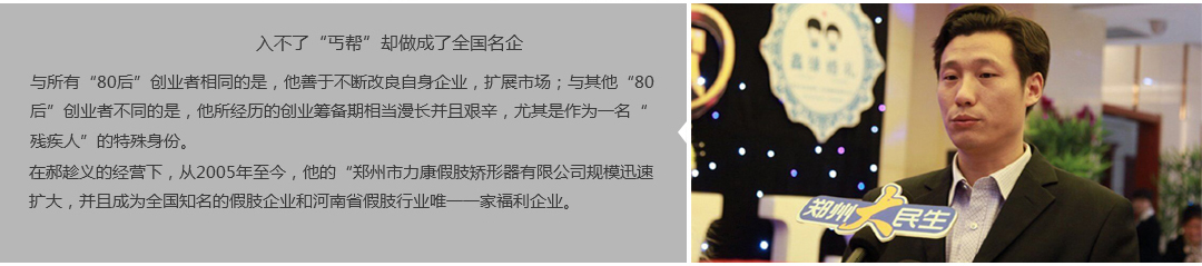 鄭州市力康假肢矯形器有限公司(簡稱力康),是一家專業(yè)從事假肢矯形器的設(shè)計、研發(fā)、制作及裝 配的專業(yè)機(jī)構(gòu)。成立于1992年是河南省唯一一家福利企業(yè)。力康下設(shè)業(yè)務(wù)部、技術(shù)部、住院部、康復(fù) 部、售后服務(wù)部,并配有現(xiàn)代化的裝配車間和功能齊全的訓(xùn)練大廳,為殘疾朋友康復(fù)訓(xùn)練提供了可靠 保障。總經(jīng)理穿戴假肢多年,有著豐富的臨床經(jīng)驗和親身體會;多年來,力康已為全國幾十萬名殘疾 朋友安裝上舒適、美觀、耐用的假肢和矯形器具,使他們更大限度地恢復(fù)了正常的工作和生活。“產(chǎn) 品即人品”的質(zhì)量理念、先進(jìn)的技術(shù)、實惠的價格、完善的售后服務(wù)是力康取勝的法寶……